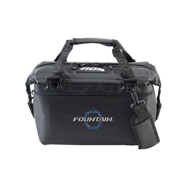 The Fountain Powerboats AO Carbon Black Soft Cooler 24 Blue Logo is a must have for a day on the boat. AO’s Sleek Carbon series is one of the best-looking coolers on the market. The carbon fiber material matches perfectly to the interior of boats and side by sides. Made with a vinyl coated fabric that looks like carbon fiber, which is widely used in both the RV and marine industries. Insulated with a ¾” thick closed cell foam to keep drinks and food ice cold weekend long. Lined with a welded TPU eco-friendly liner that is leak proof. Features four tie-down hooks to strap it down in any off-road vehicle.